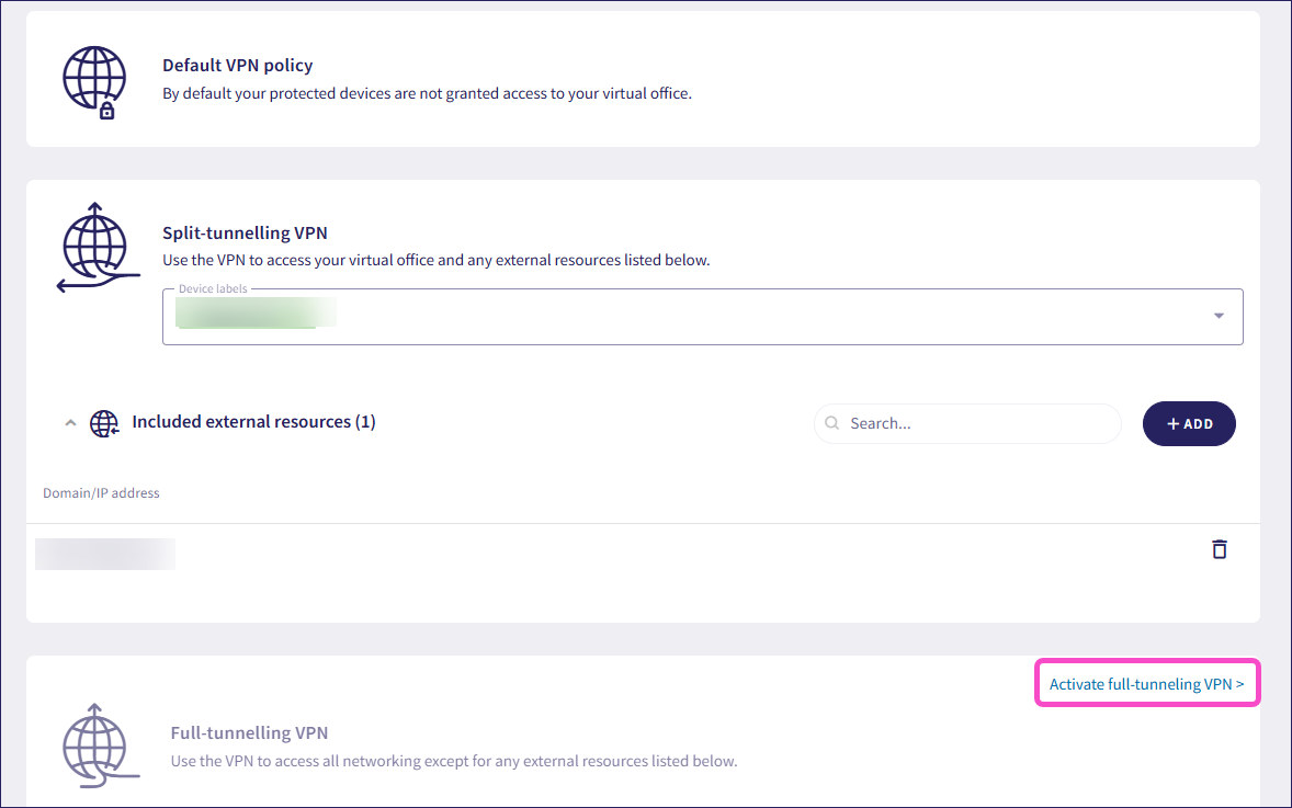 To add labels to the full-tunneling VPN for the first time, select Activate full-tunneling VPN: