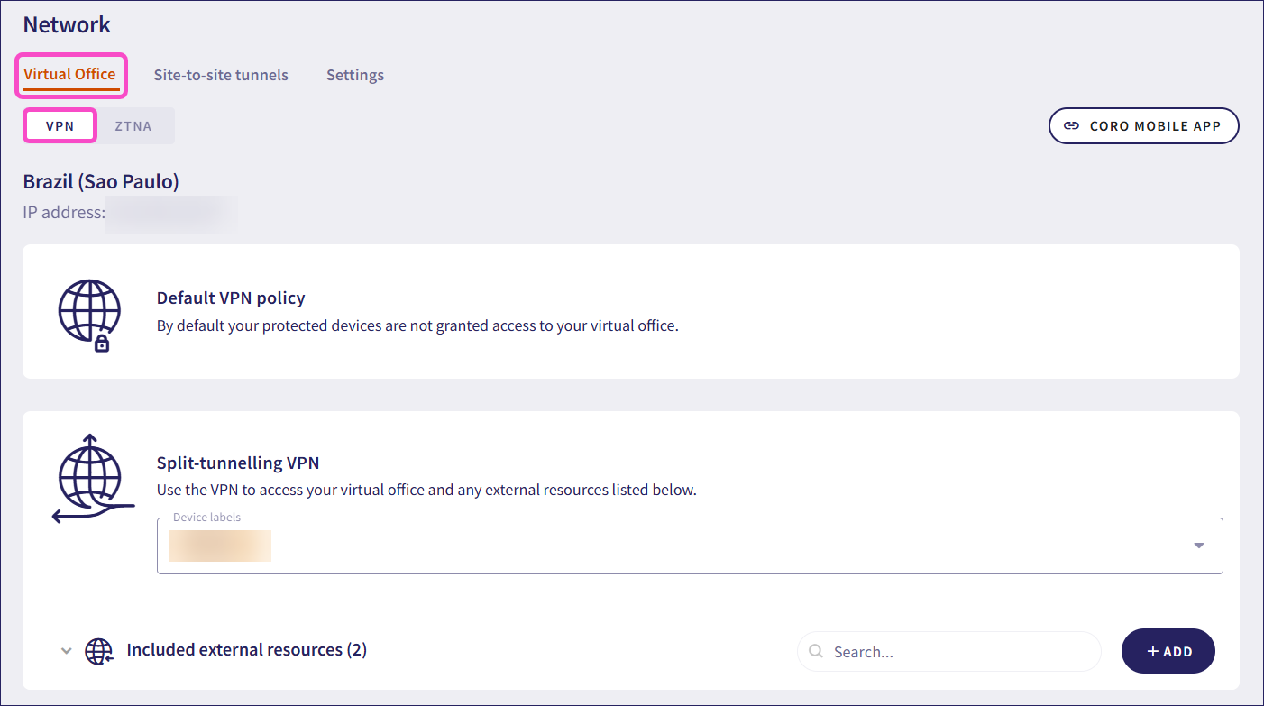 - Any devices added to the split-tunneling VPN can access the virtual office and any external resources added to the include list.