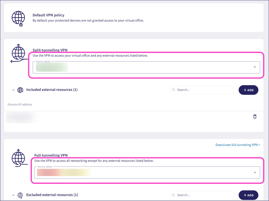 Split-tunneling VPN: Devices with this policy use the VPN to access and encrypt your virtual office, as well as any external resources that have been added to the include list. For more information, see Understanding external resources in VPN policies.