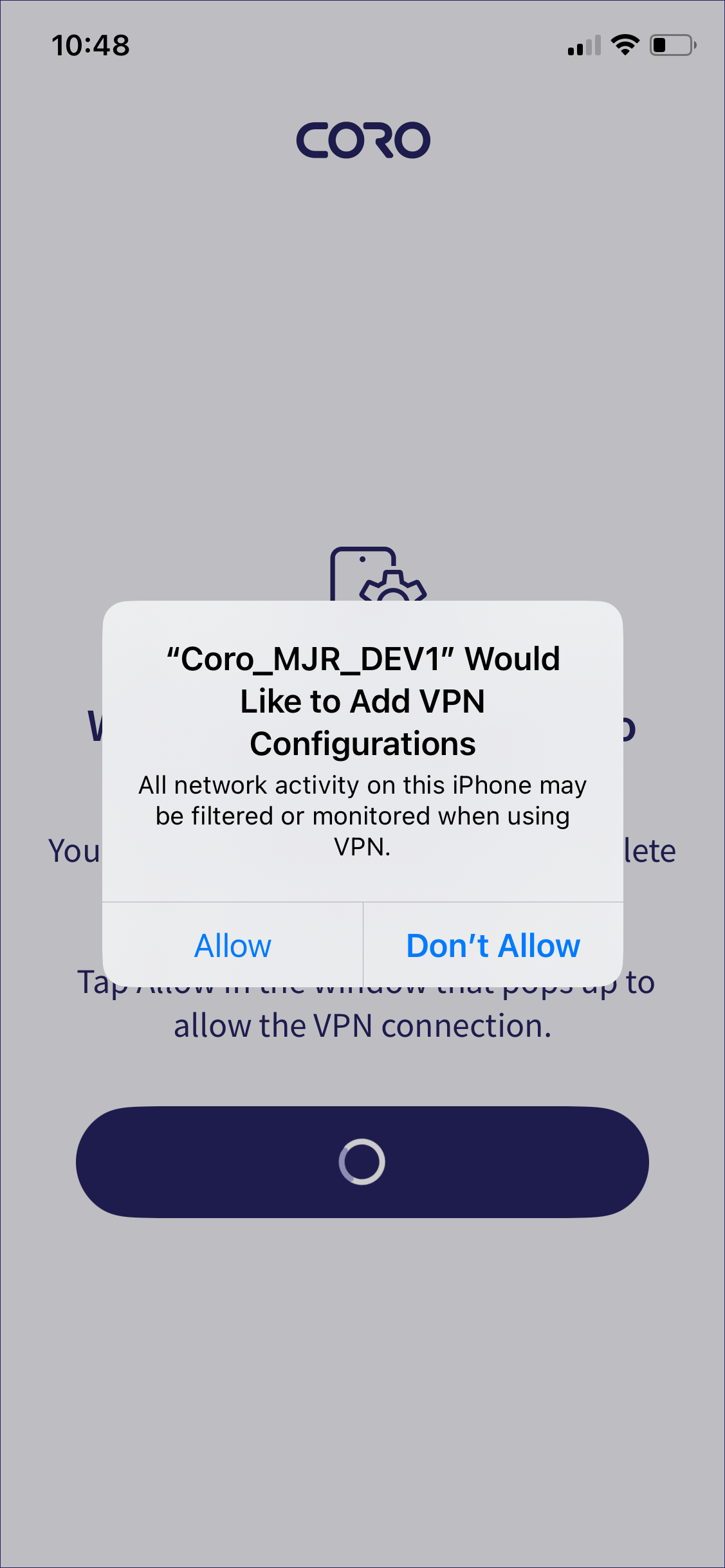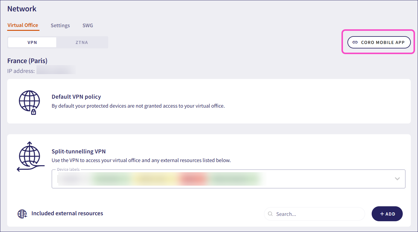 The Coro Endpoint Protection app enables Network service protection on iOS and Android devices. The app works with the Network and SWG modules. At least one of these modules must be enabled, and users downloading the app must be added as protected users. The mobile device must be assigned a device label which is added to VPN, ZTNA, or DNS filtering. The app supports Android 12 or later and iOS 17 or later.