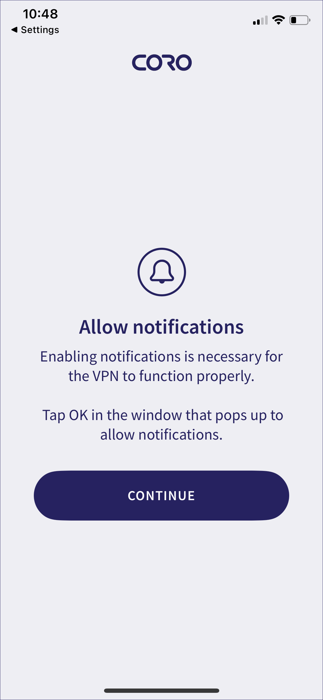 In the app, select CONTINUE to enable notifications from Coro to your device: