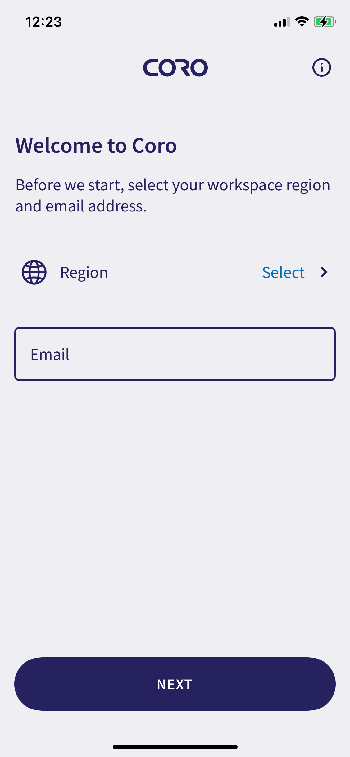 Open the app and enter your workspace region and work email address. Then select NEXT:
