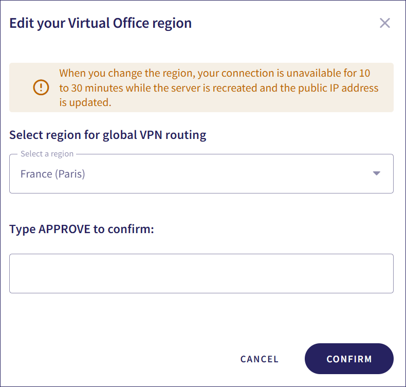 When you change the region, your connection is unavailable for 10 to 30 minutes while the server is recreated and the public IP address is updated.