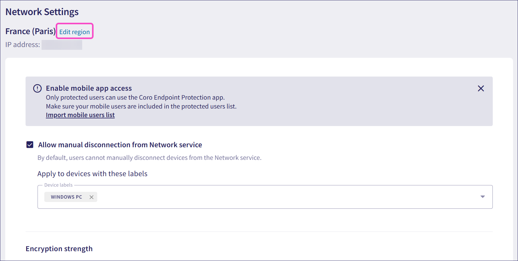 Coro Network and SWG use the region selected during activation. Admin users with sufficient permission can change this region from the Network Settings page. Your region should be close to your physical location to help improve speed and performance.