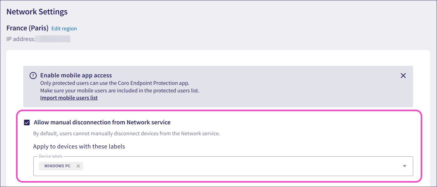 Add the device labels for the devices that should manually disconnect from the Network service..