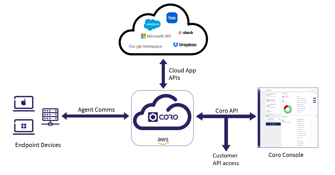 Coro maintains the core cloud service and provides access to the console for subscribers to configure their protection and monitoring settings. Through the console, Coro also provides access to the Agent software that subscribers can download and deploy to their endpoint devices.