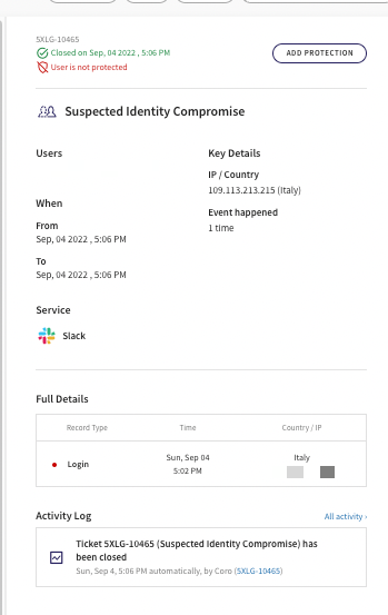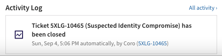 - For unprotected users, Coro continues to generate tickets related to unprotected users, and these tickets are only accessible via the Ticket Log view. Additionally, these tickets are now: