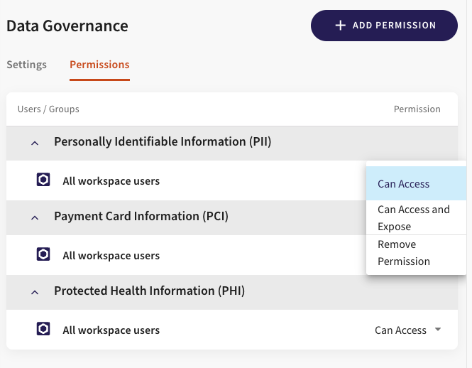 You can change the default policy of permissions by adding or removing permissions to the access and expose data objects that might contain personally identifiable information (PII), payment card information (PCI) and protected health information (PHI).