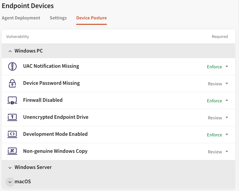 The new Device Posture settings allows the operators to specify what device vulnerabilities are of interest, for which environments (Windows PC, Windows Servers, and macOS), and to what extent.