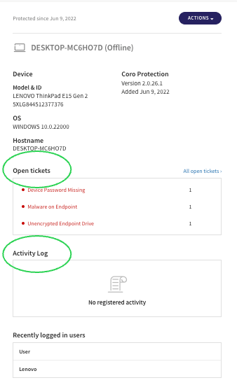 The Users and the Devices sections now also include information from the Ticket Log and the Activity Log, embedded within the card for the specific object.