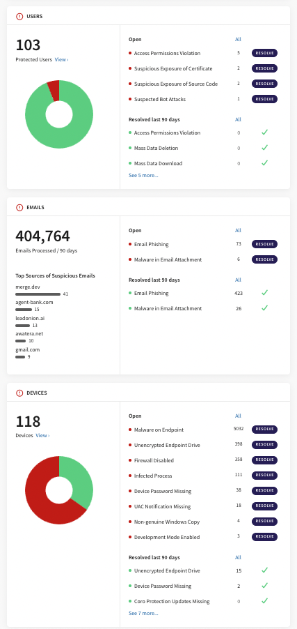 Coro detects files and processes on the endpoint devices suspected as malicious, as well as various vulnerabilities in the security posture of the devices.