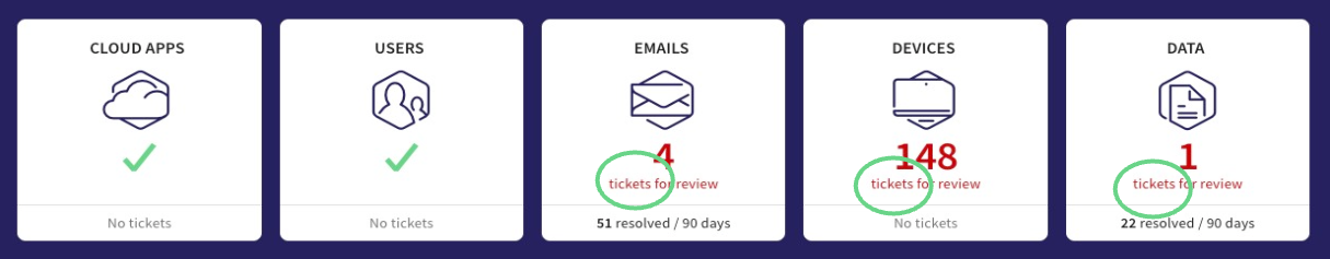 - Module - filter to see tickets for only devices, cloud apps, email, users, data or for all modules together
