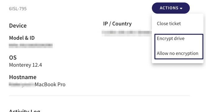 View tickets related to endpoints from the Ticket log using the filter for Devices. Tickets created for endpoints include: