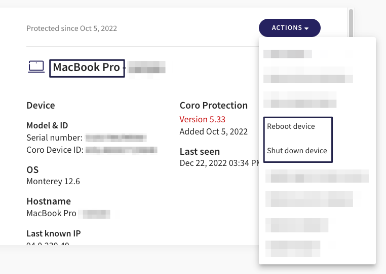 - Remote shutdown and reboot device actions are available from the Coro Console for macOS devices.