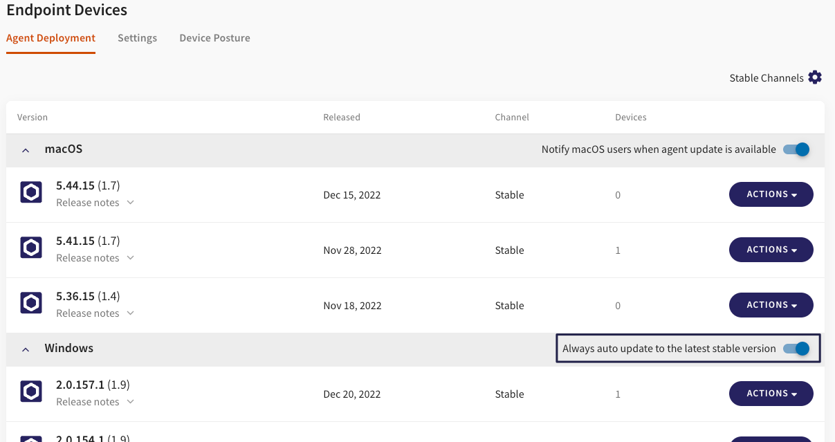 The "notify" toggle has been updated to "Always auto update to the latest stable version. This is the default for Windows endpoints. When necessary, the end user receives notification that they must restart their device. Users can opt to reboot immediately, or to delay the reboot by one hour.