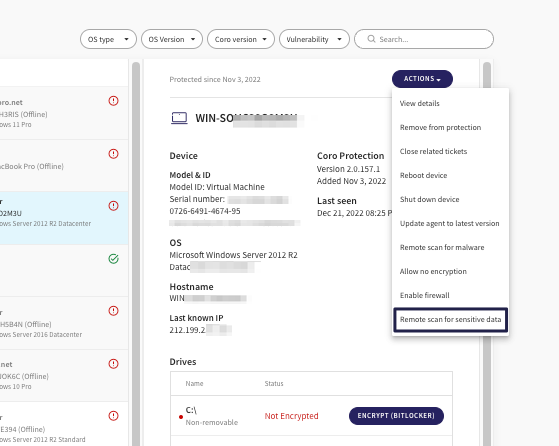 From the Coro Console, administrators can run a scan remotely on single or multiple devices to discover all sensitive data issues. From the Devices section, navigate to the relevant device, select Actions and choose Remote scan for sensitive data: