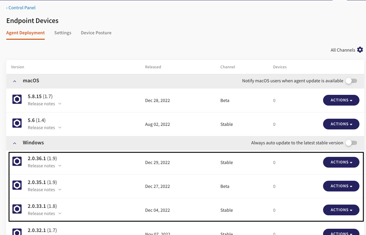 Note: the agent is in beta status and will be upgraded to Stable approximately 1 week following the initial release of v1.9. As indicated in v1.8, beta and stable versions can be accessed from the Coro Console at Control Panel > Endpoint Devices > Agent Deployment.