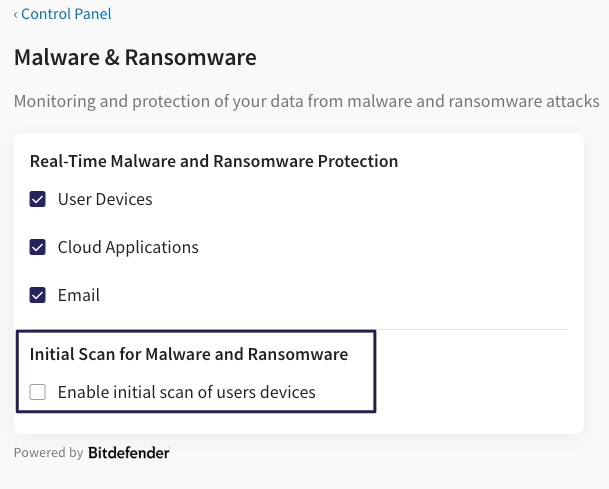 - For Windows endpoint devices with the 1.9 agent installed, the Initial scan option for endpoints is now available at Control Panel > Malware&Ransomware.