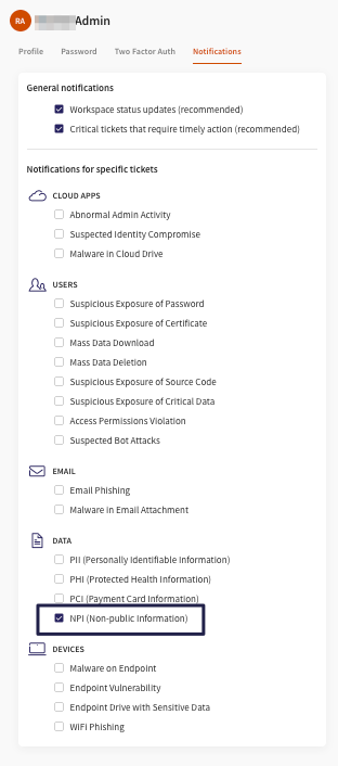 All administrators of the Coro Console can configure notifications for NPI from the avatar menu by selecting My Account > Notifications: