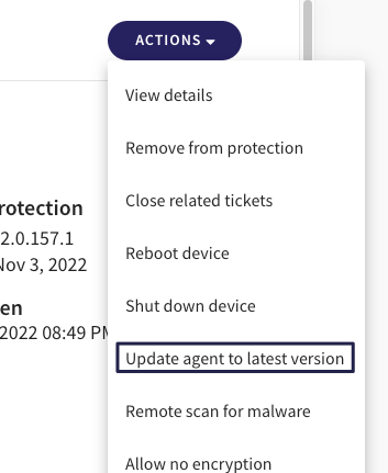 Remote scan for malware in the Action menu from the Devices page, originally available in the release notes for v1.5, was redesigned and is now available starting with v1.8 for endpoints that are updated with the relevant agent version. Agents and their versioning can be found and downloaded from your workspace at Control Panel > Endpoint Devices.