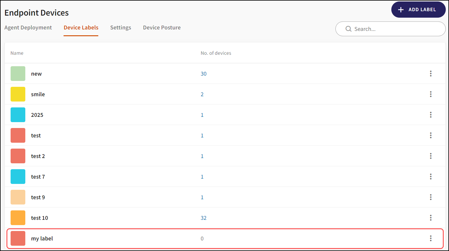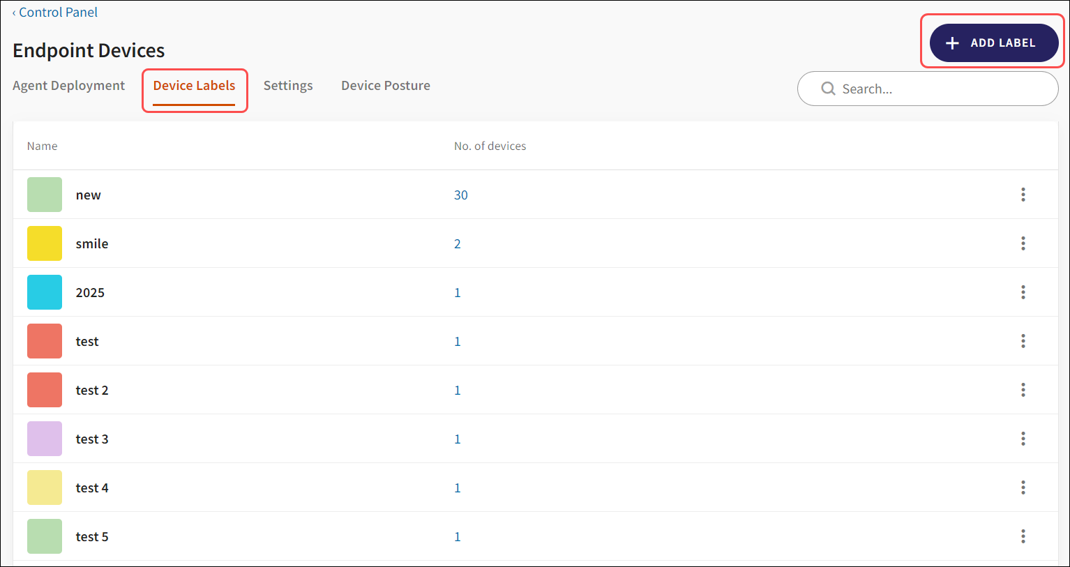 Click Manage labels to navigate to Endpoint Devices > Device Labels. From here, administrators can create and manage labels.