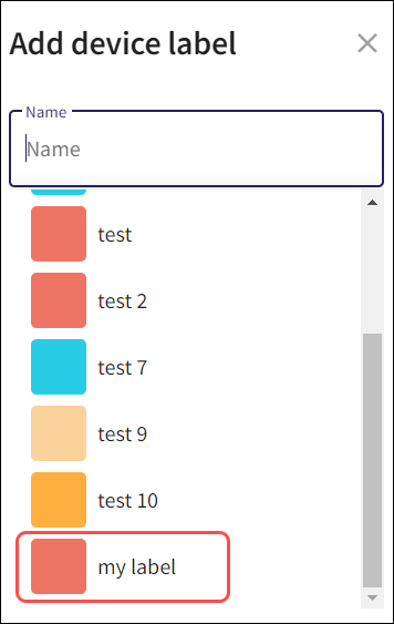You can select a label from the device label list by clicking the Name field. You can also start typing a name to automatically find the label in the device label list: