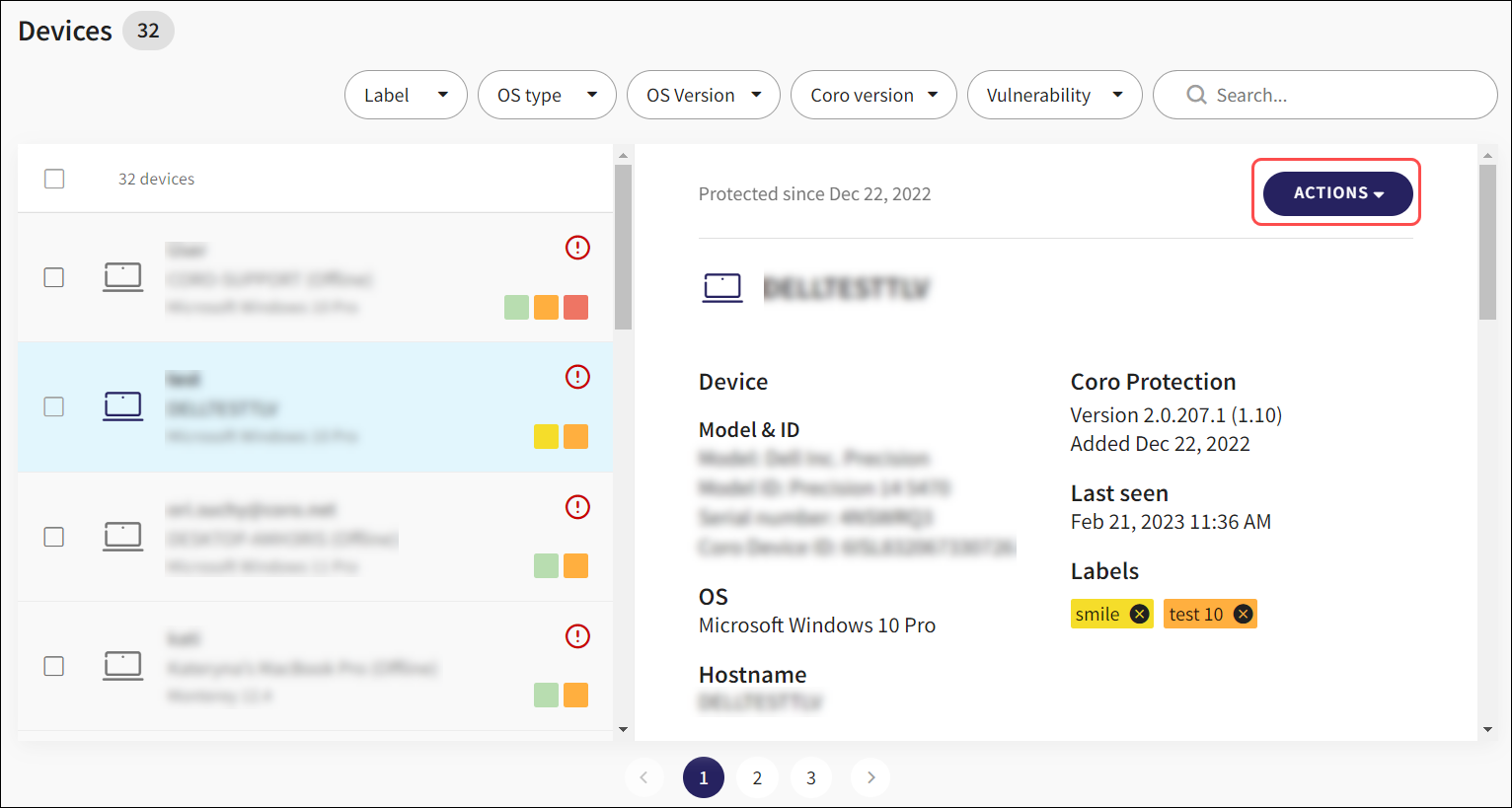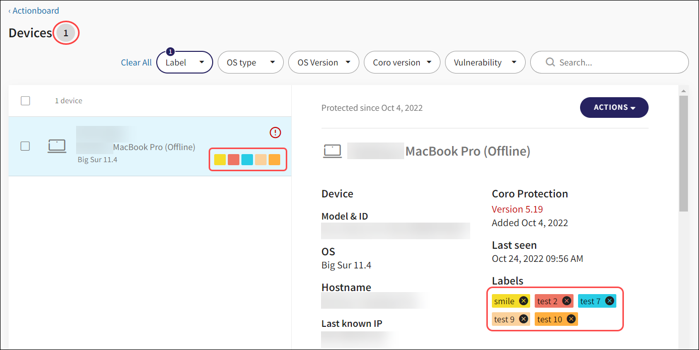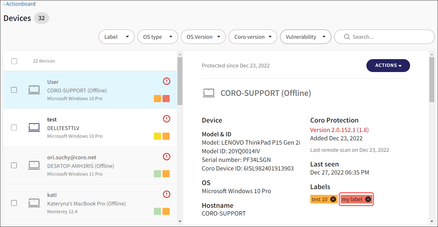 Coro now supports the creation of custom device labels. Device labels can be used to group related devices. Once devices are assigned labels they can be used as filter criteria to search for related devices. Device labels are displayed for each device in the Devices list and in the Device details pane: