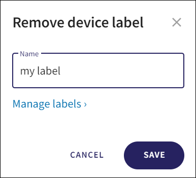From the Devices page, select the device from the Devices list and select the cross icon in the label you want to remove:
