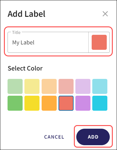 The Add Label dialogue is displayed. Provide a label Title, choose a color from Select Color, and click the Add button: