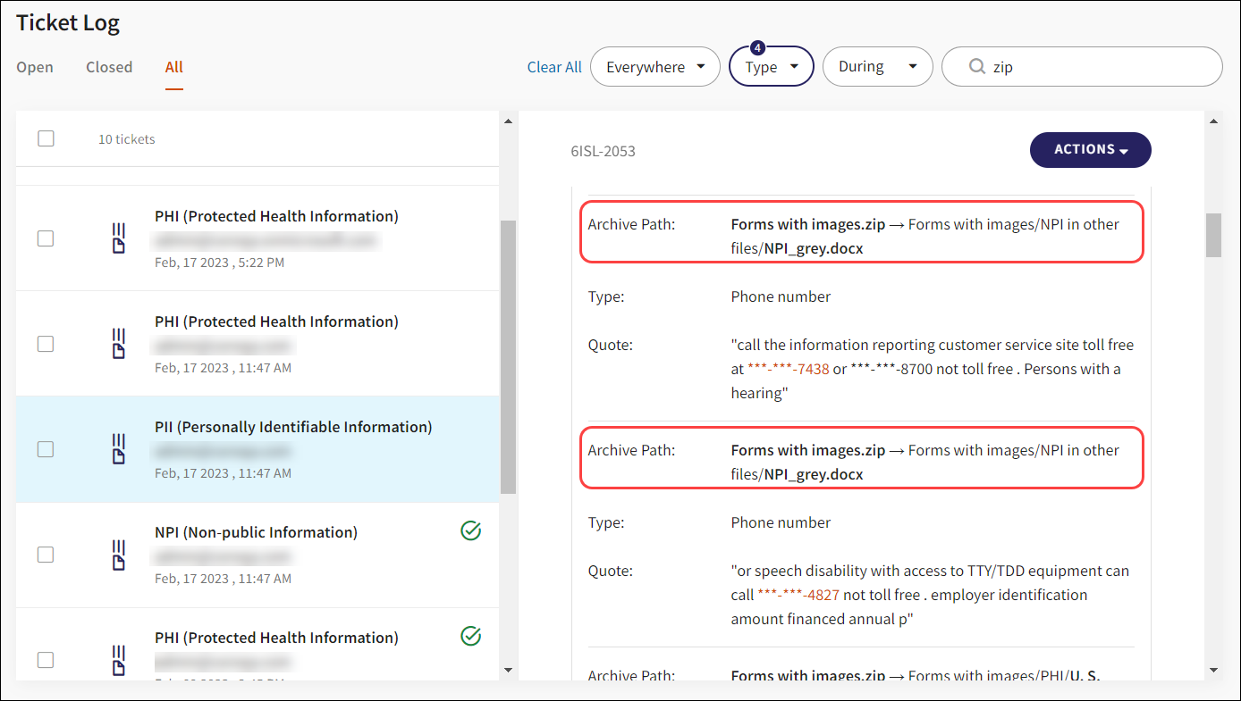 Tickets are now created for each archive or email file per DLP type (NPI, PII, PHI, PCI):