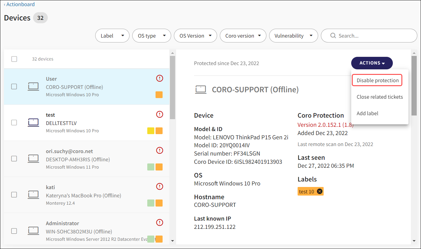 The Remove from protection action under Devices has been changed to Disable protection: