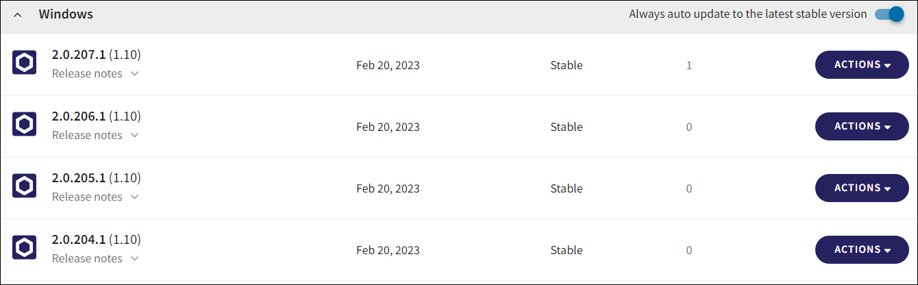 Agents and their versioning can be found and downloaded from your workspace at Control Panel > Endpoint Devices > Agent Deployment:
