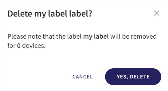 Click Delete label to delete an existing label. A confirmation dialog is displayed which includes the number of devices the label is assigned to. Click Yes, Delete to delete the label. The label is deleted and removed from all devices in the Devices list and Device details pane:
