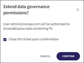 If the Add to data governance permissions action is selected for an Open ticket, the following Extend data governance permissions dialog is displayed:
