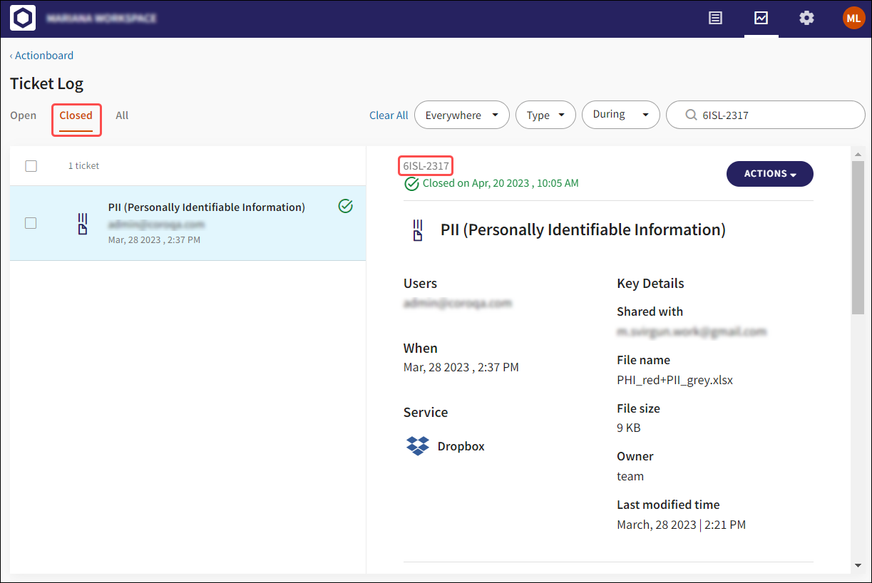 The ACTIONS menu allows Coro administrators to select Add to data governance permissions and perform permissive actions directly from Data tickets.
