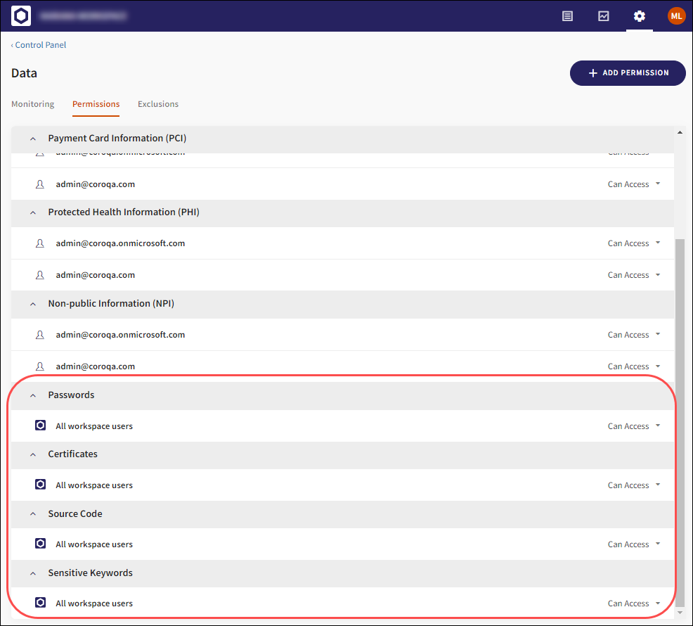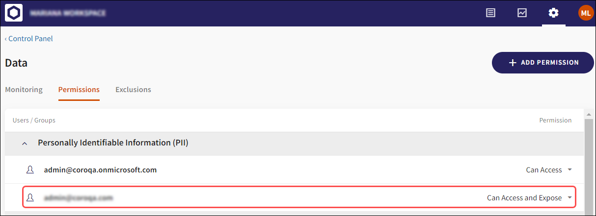 Select the + ADD PERMISSION button to configure custom data permissions.