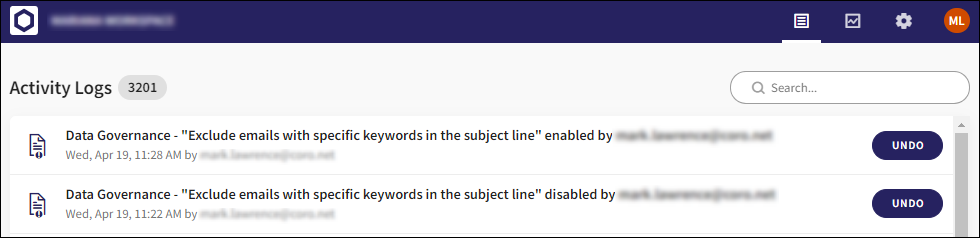 When Exclude email with specified keywords in the subject line is enabled or disabled, an entry is created in the Activity Log: