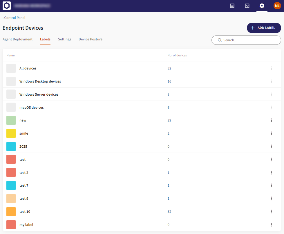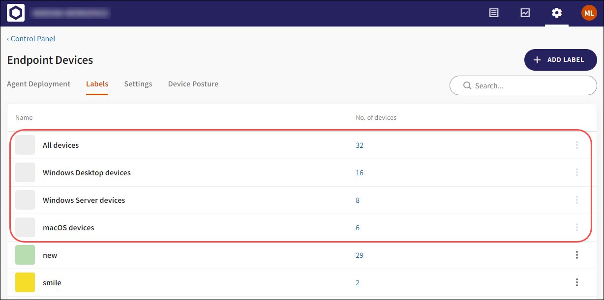 Pre-defined labels are displayed on the Labels tab under Control Panel > Endpoint Devices. Pre-defined labels cannot be edited or deleted, and do not have an associated action menu: