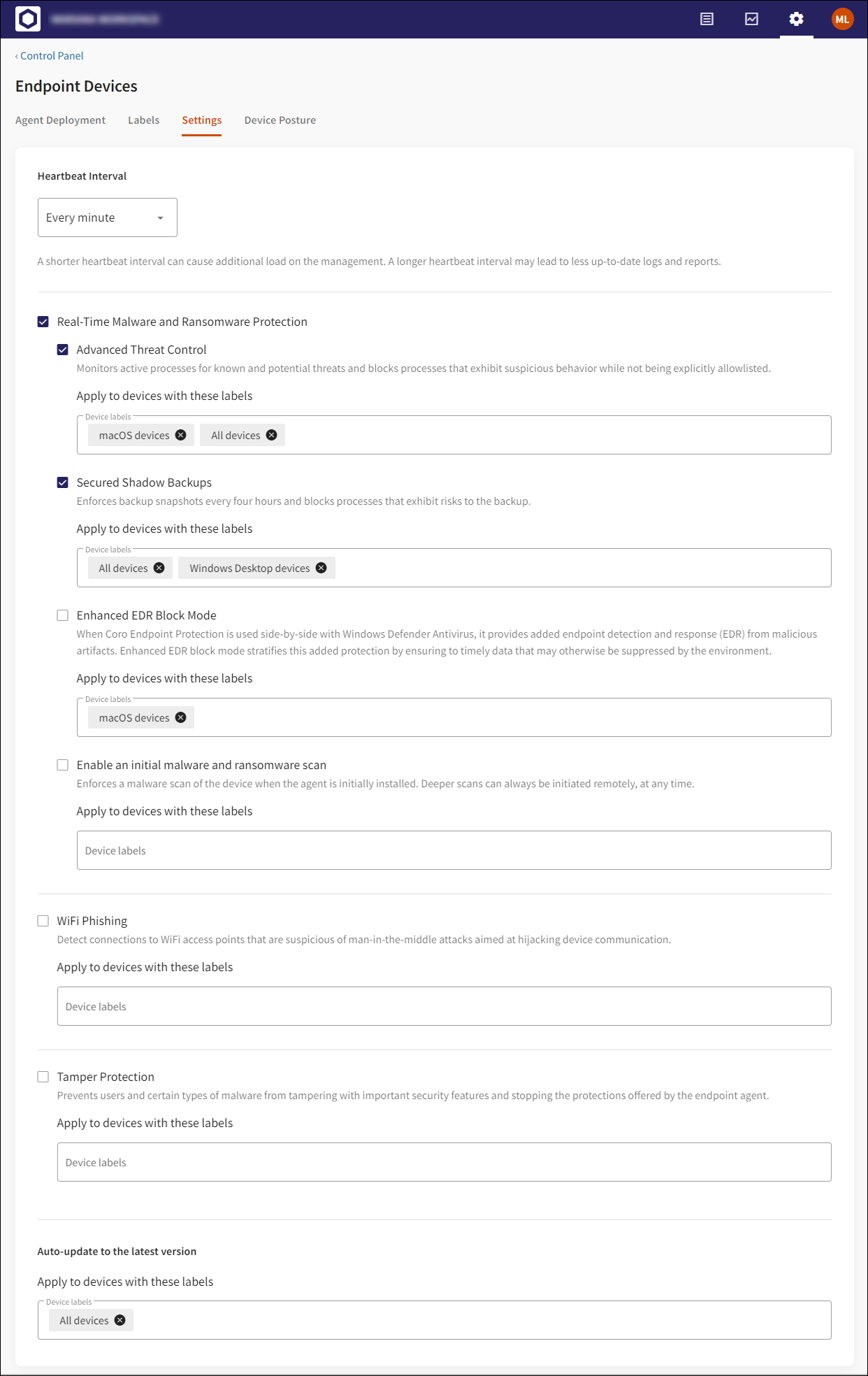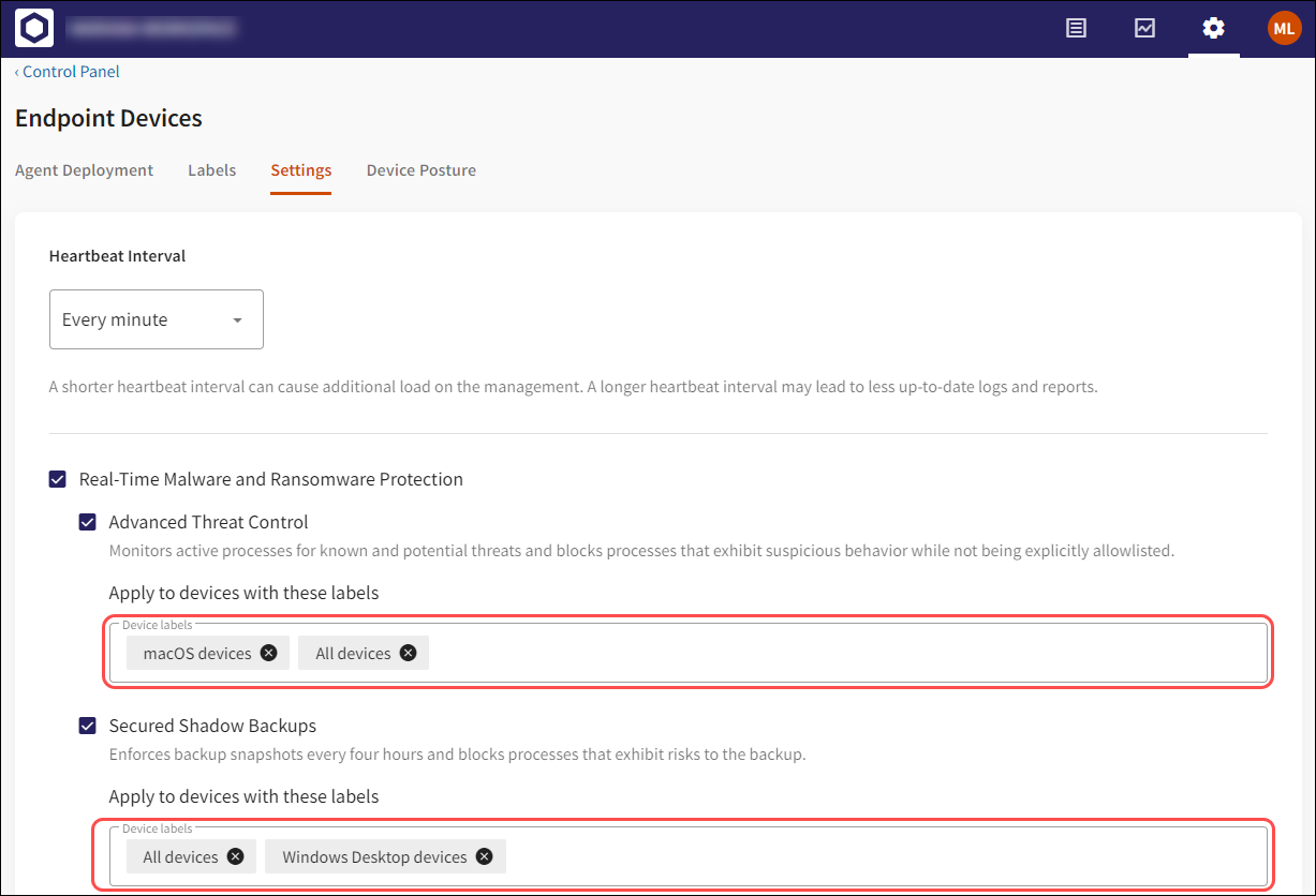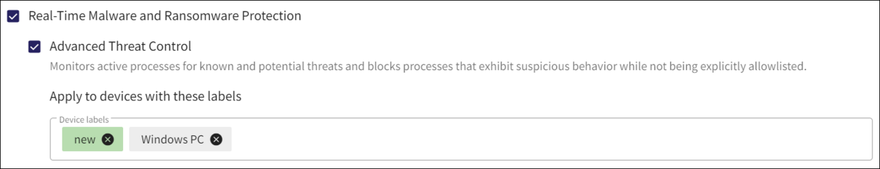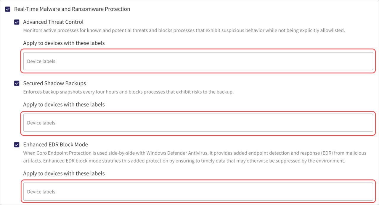 Applying device labels to a specific device protection setting has no effect if Real-time Malware and Ransomware Protection or any related child settings are not enabled.