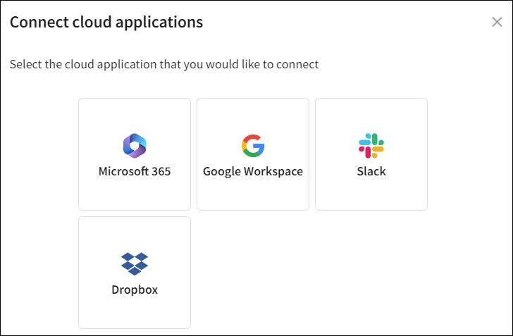 Select + CONNECT to display the Connect cloud applications dialog, which enables you to connect to cloud applications that are not currently connected.