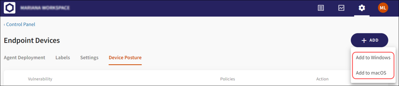 Select the Add button at the top right of the screen. From the dropdown, select the operating system for which the new policy is added (Windows or macOS).