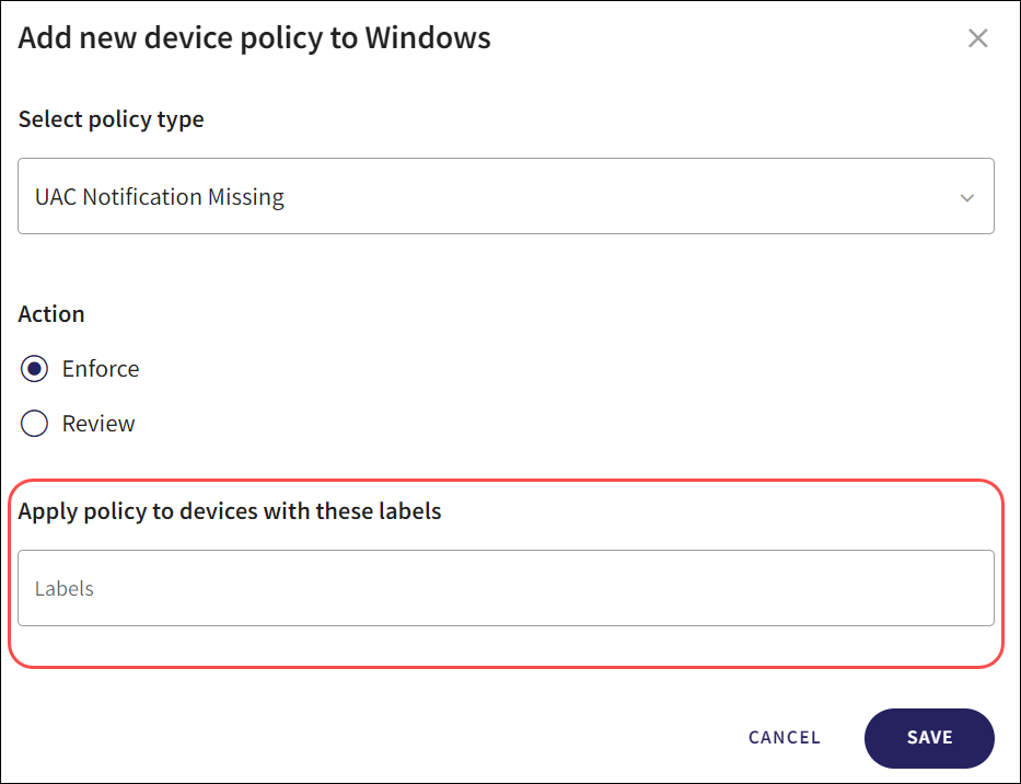 From the Add new device Policy dialog, select the Labels section under the Apply policy to devices with these labels header.