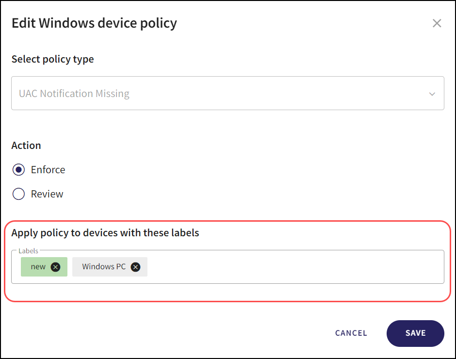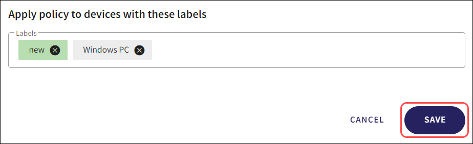 From the Edit device Policy dialog, select the Labels section under the Apply policy to devices with these labels header.