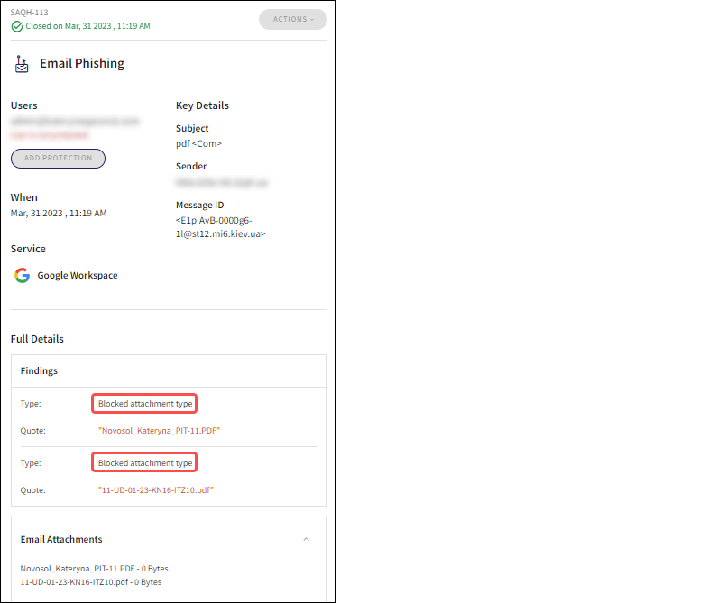 Incoming emails containing attachments of the file types defined are automatically quarantined, and an Email Phishing ticket is created with a finding of Blocked attachment type: