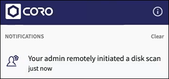 After a disk scan is remotely initiated, a notification is displayed.