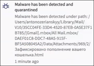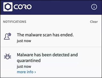 After the scan completes, a notification is displayed. If any threats were detected and quarantined by the scan, a separate notification is displayed. Select more info to display further information related to the quarantined threats.