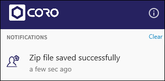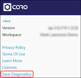 The Save Diagnostics option allows you to download a zip file containing diagnostic information. You can send this file to the Coro support team and they can use it to troubleshoot issues.