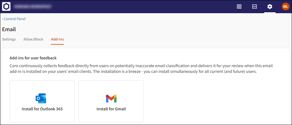 The new Add-ins tab contains the functionality previously contained in the User Feedback section (Phishing > Settings.)