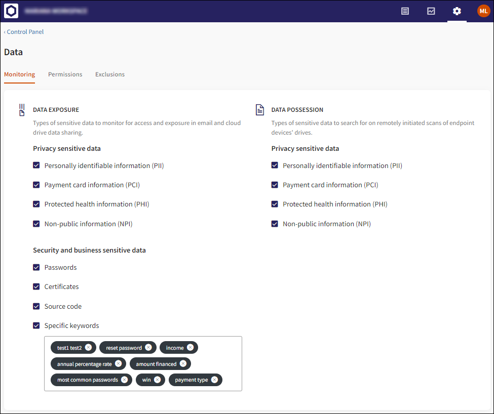 Security and business sensitive data (previously located in the Custom Data tab): Allows you to specify monitoring of additional sensitive data, including Source code and Passwords