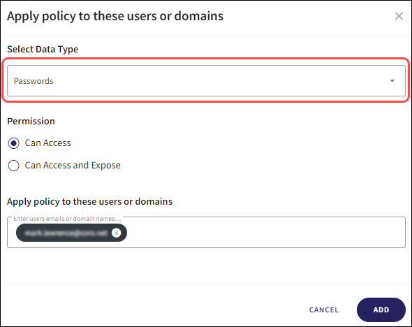 The Data Type for which the policy is applied (in this case one of Passwords, Certificates, Source Code, or Sensitive Keywords)